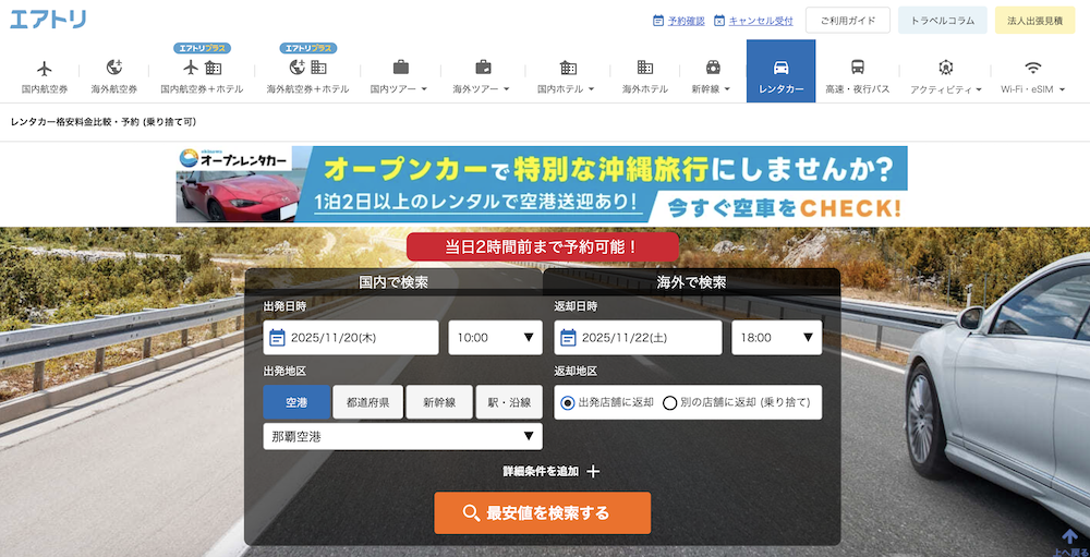 エアトリでは、航空券だけでなく、ホテルやレンタカーの料金も比較することができます。