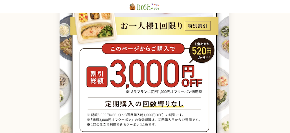 こちらは、nosh(ナッシュ)が通常している初回限定クーポンです。