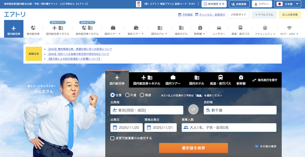| エアトリ | ・航空券 ・航空券+ホテル ・ツアー ・ホテル ・レジャーパック ・新幹線 ・レンタカー ・夜行/高速バス ・キャンプ |